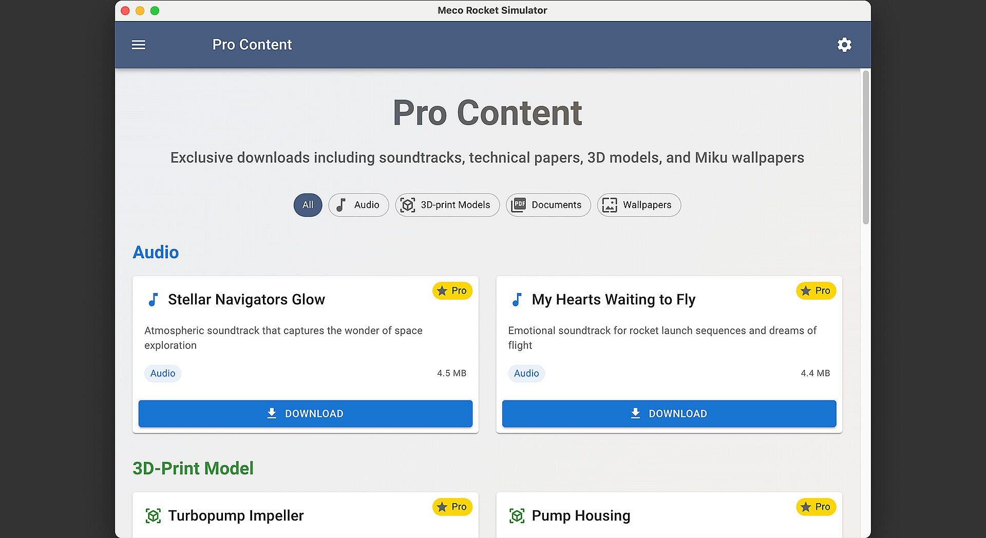 Players who own Meco Rocket Simulator grab this Pro DLC to back ongoing development and unlock exclusive extras. It delivers PDF technical papers that detail the science powering the simulation engine, plus 3D-print files for turbopump geometry to build educational desk models. Hi-res wallpapers feature the game's mascot, Miku, as your guide. Future updates add free export files for nozzle and injector parts, scriptable custom components, scriptable custom UI, and advanced fluid network solvers. Indie simulation fans with a passion for rocket tech dive into these behind-the-scenes assets. Early Access keeps content evolving for dedicated enthusiasts.