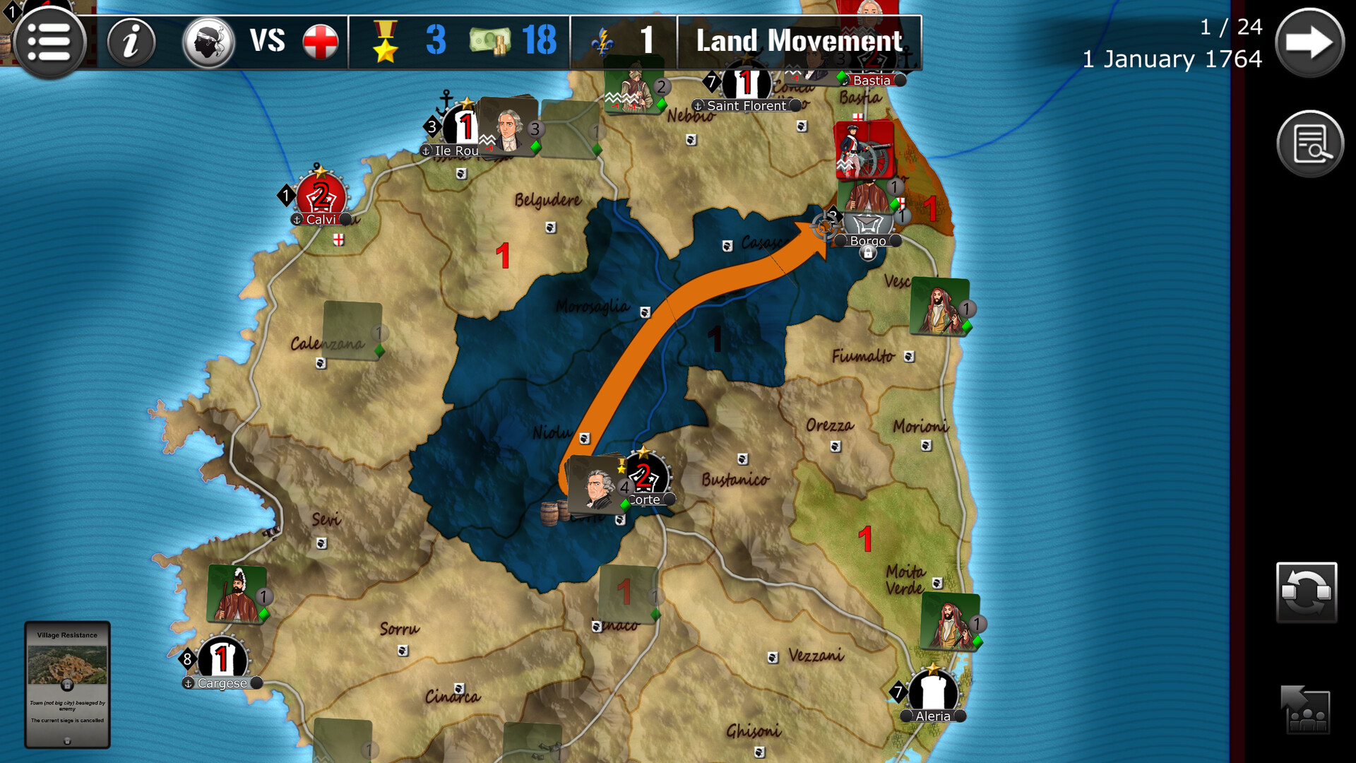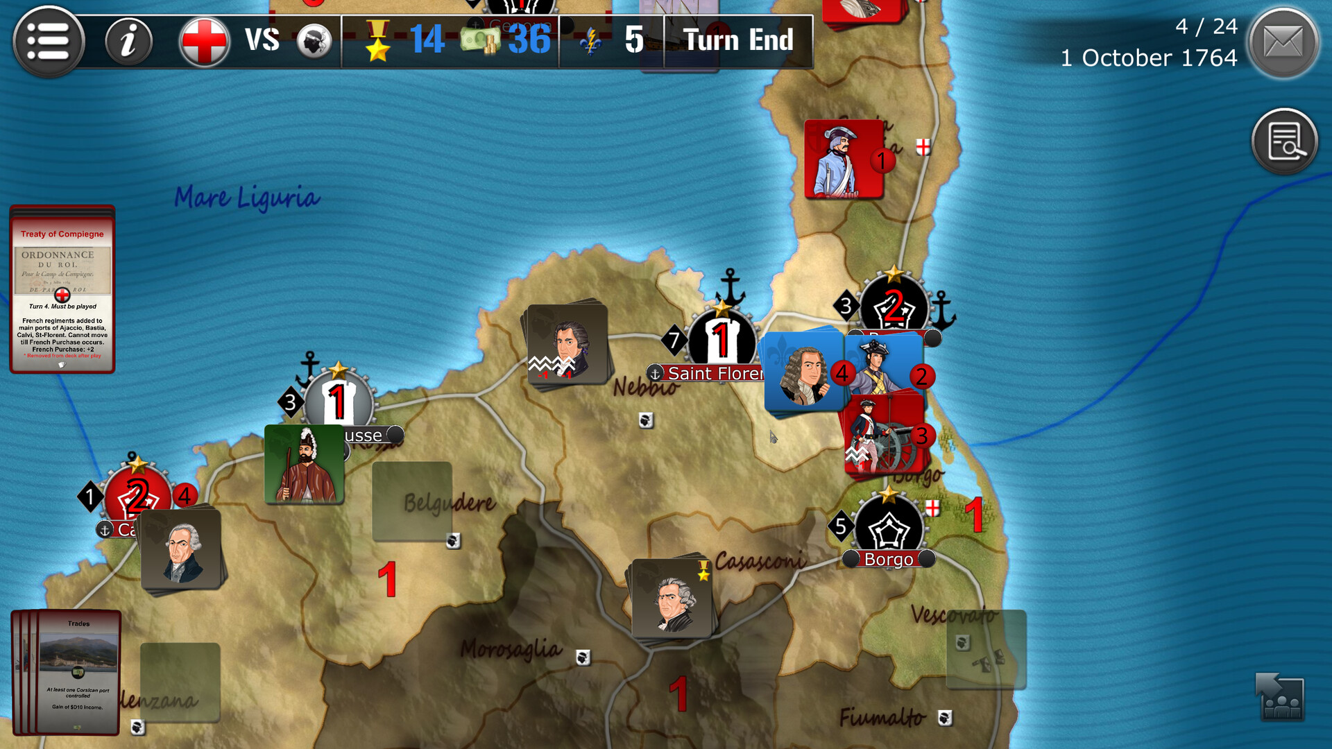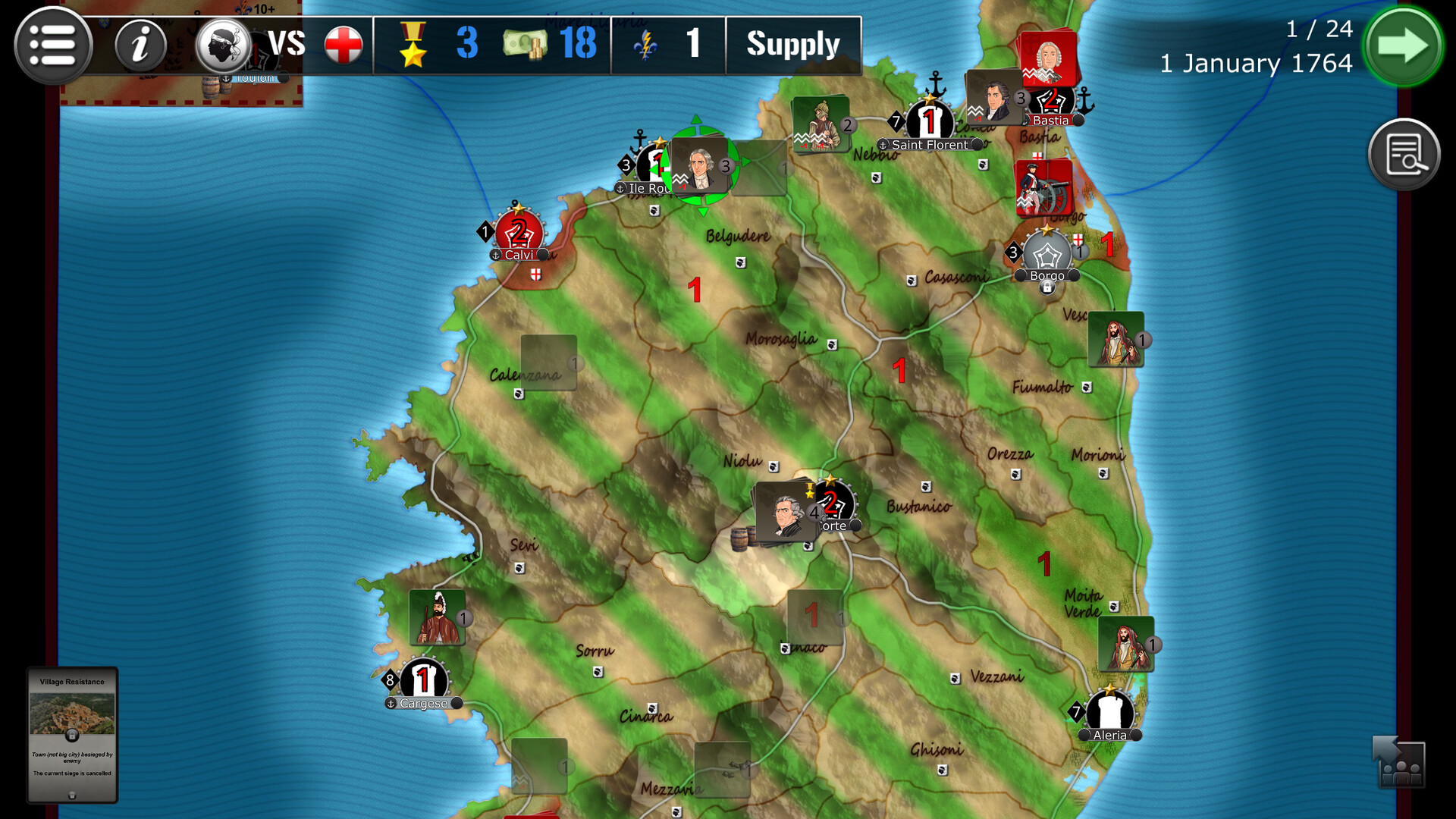 • The Corsicans have few units and should build up strength, anticipating Genoese withdrawal and French intervention. Their ability to cut supplies and maneuver may help them stand in the long run.