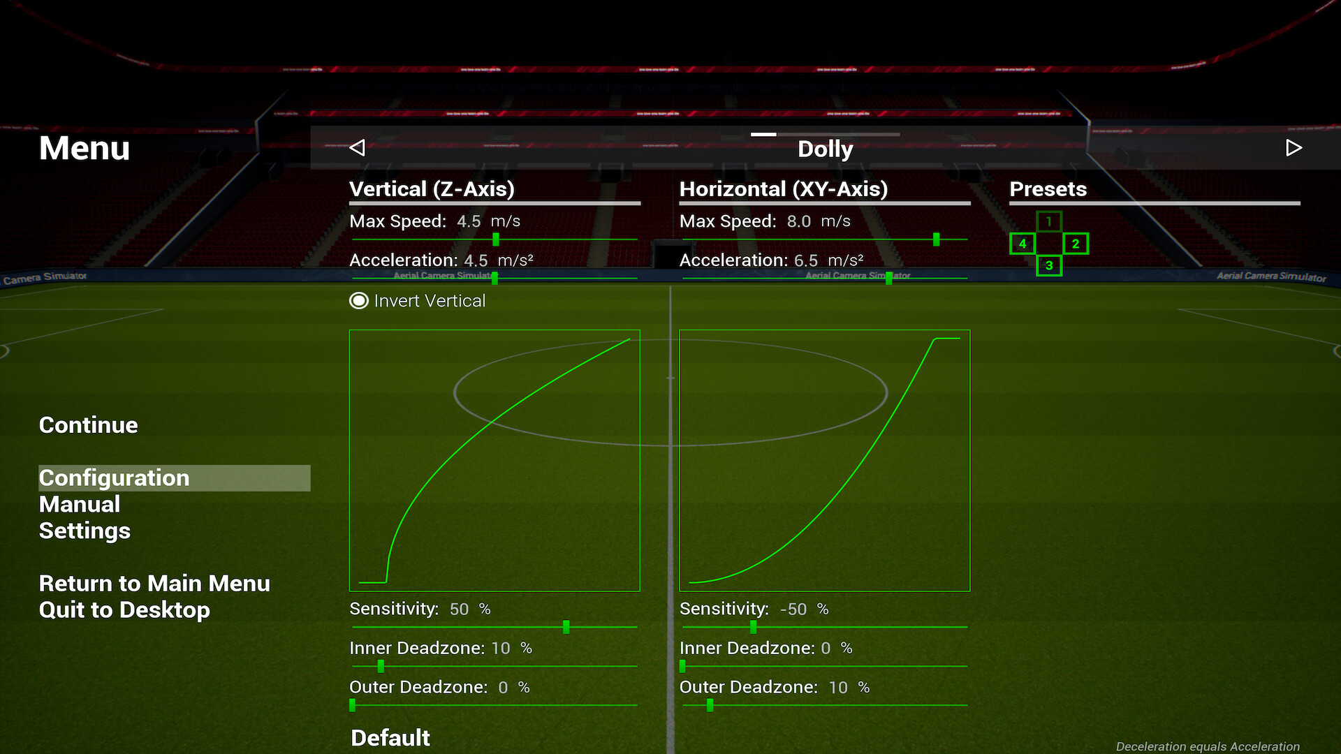 CONFIGURATION: Customize control parameters including adjustable speed and acceleration for dolly movement (vertical/horizontal) and camera head control (pan/tilt/zoom). Vertical axis inversion is available for both. Fine-tune responsiveness through configurable sensitivity, response curves, and inner/outer deadzones. Save up to four presets to quickly switch configurations mid-flight.