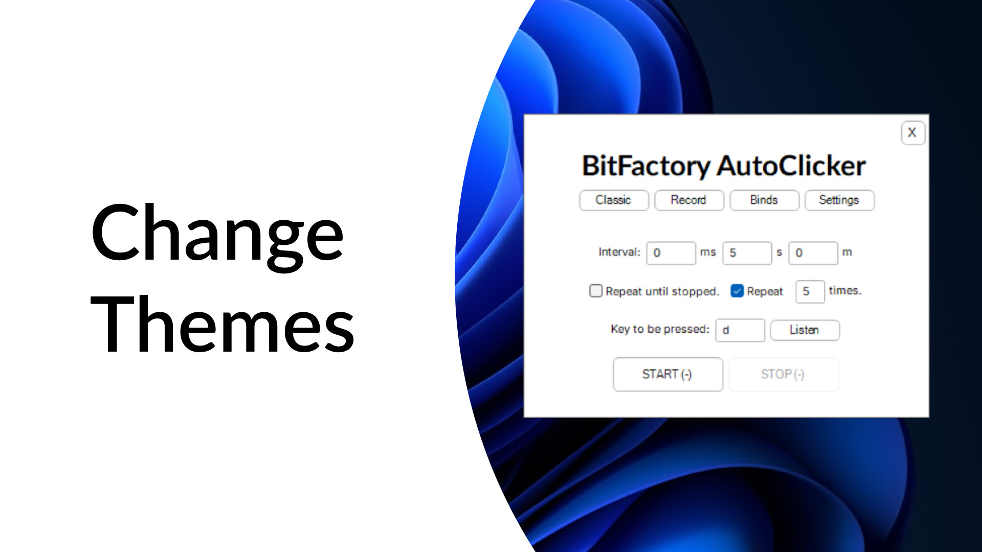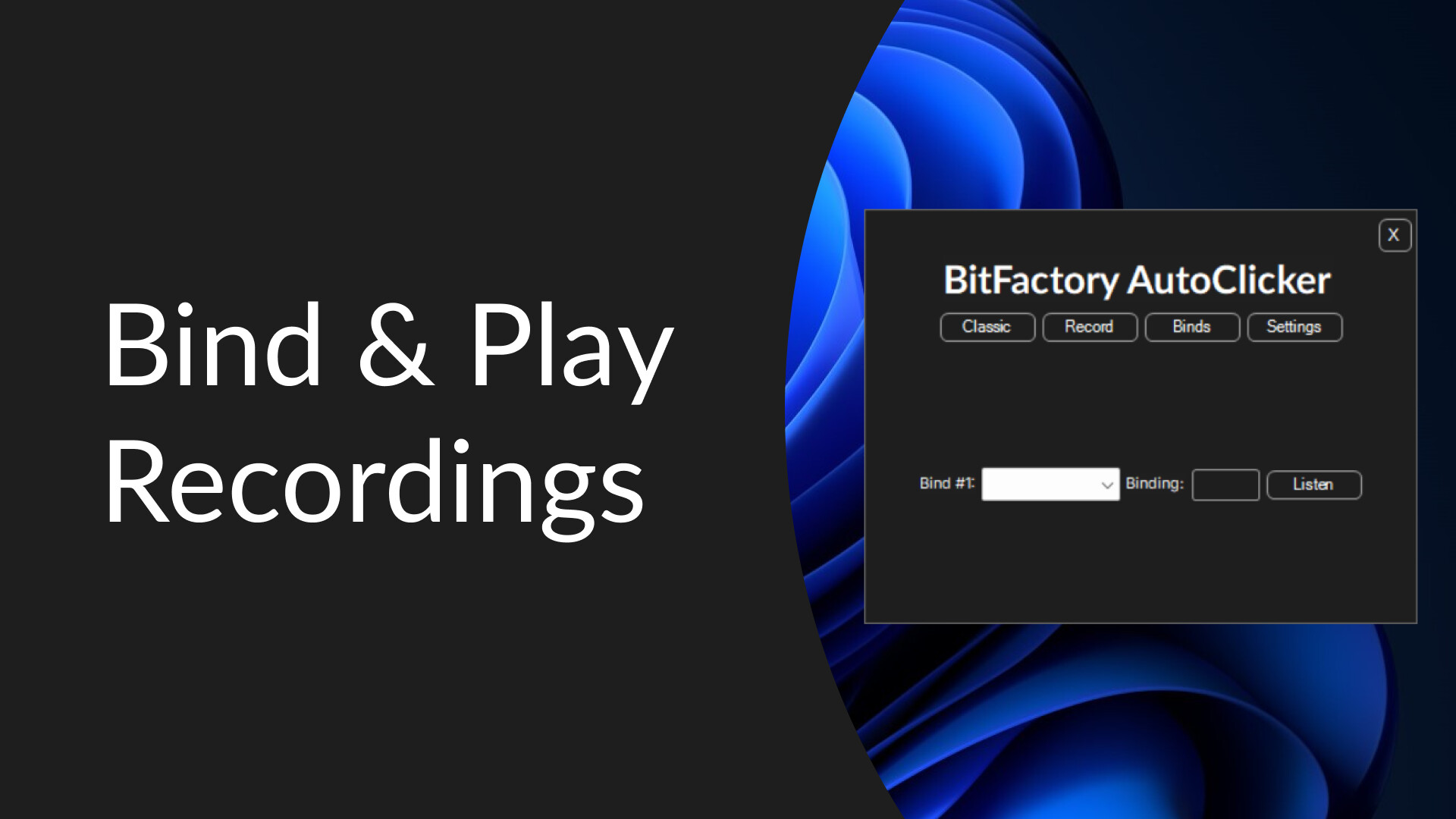 In the "Classic" section of BitFactory, you will find a traditional auto-clicker. You can chose the key to be pressed, the interval of the press, and how many times the press is to be repeated.