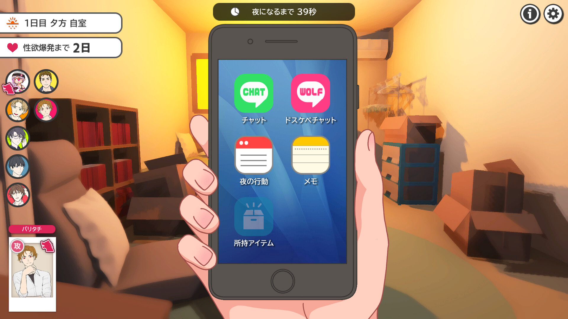 The game is repeated five times (for five days) through three phases: day, evening, and night.