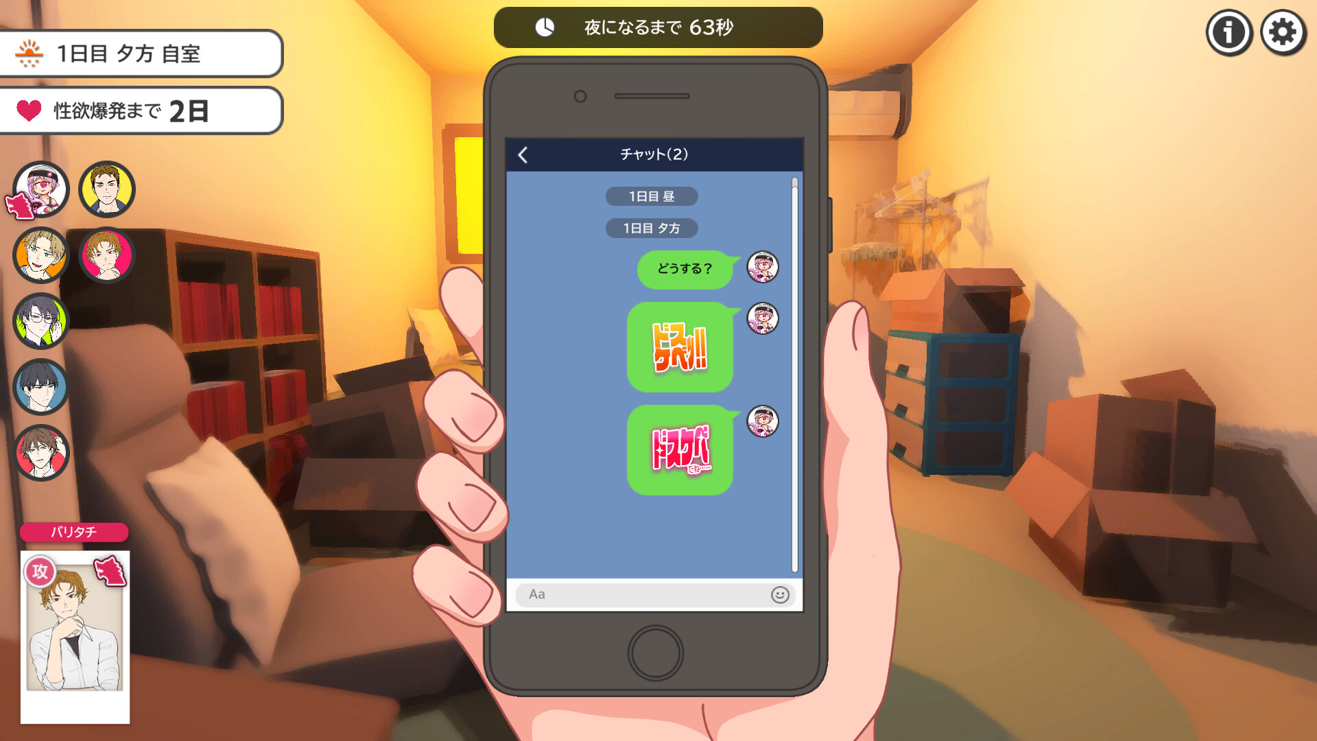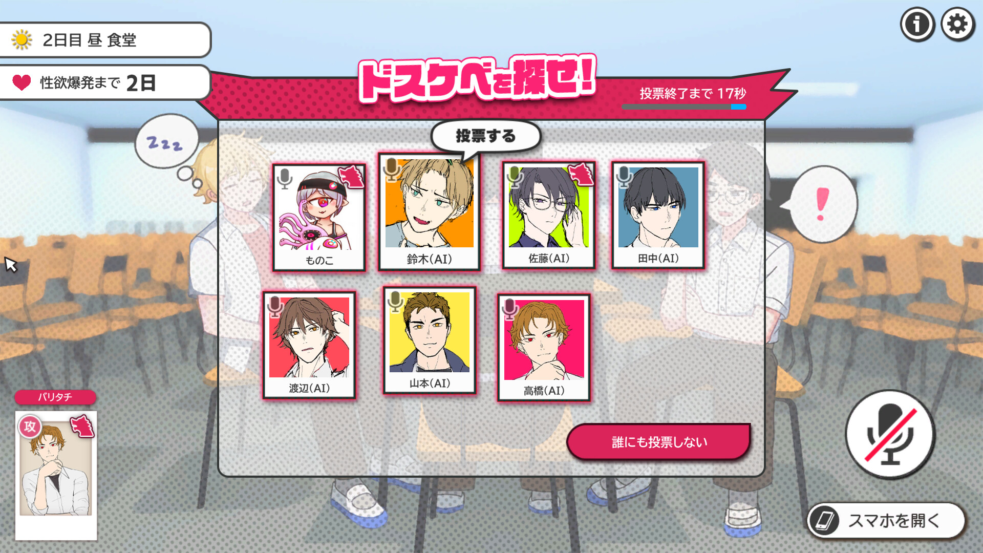 During the day phase, players discuss who is the most perverted, and can choose one person per day to suspend.