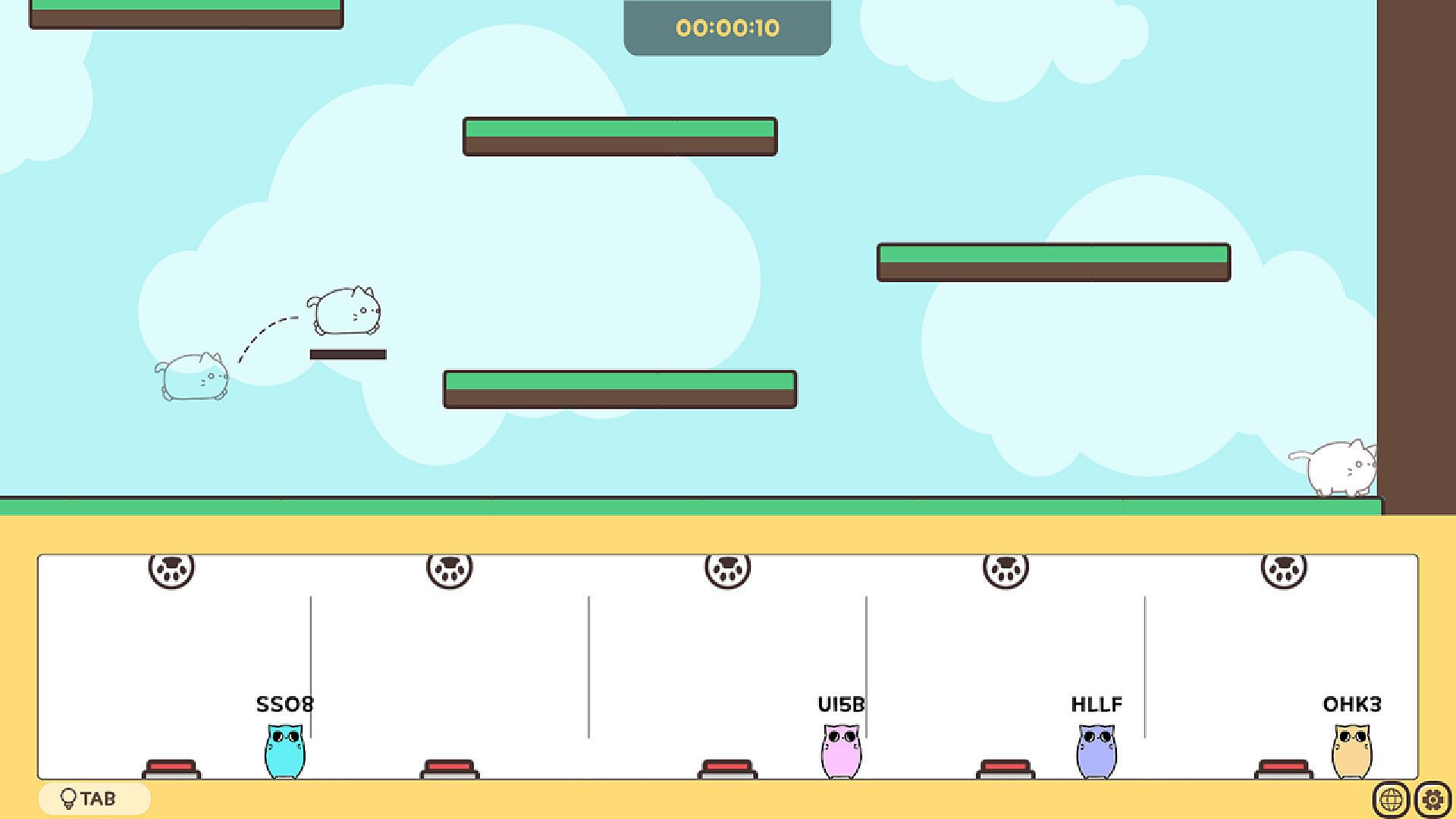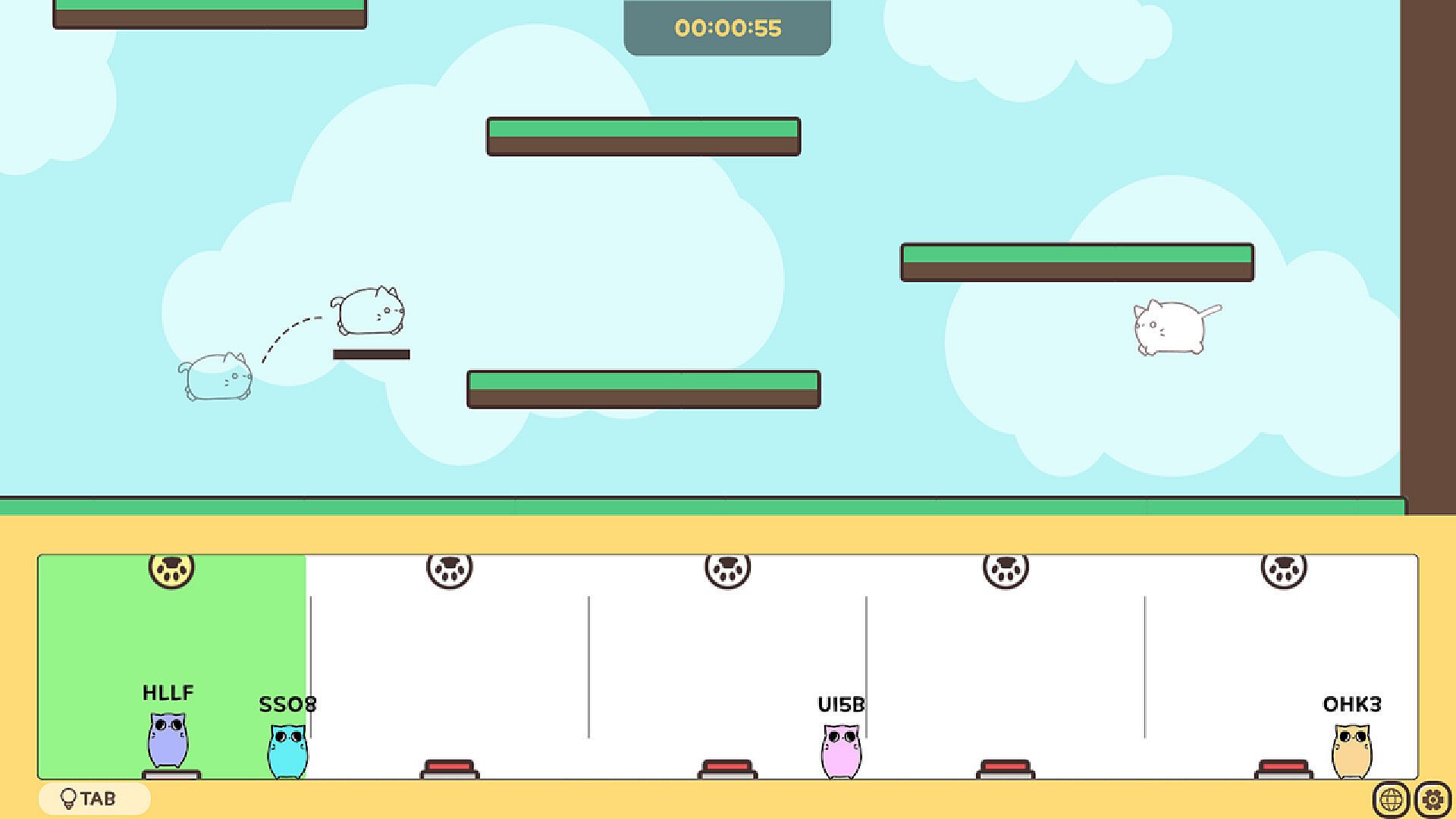 The cat constantly moves based on the combination of lights in the rooms of its mind. Thought you safely landed on the next platform? Did the other players think so too? The cat's state of mind changes the moment someone presses or releases a button. And when the state changes? The cat will immediately do something wildly unpredictable. But you can't just stand still, either! Standing still in a room might be the exact right move, or standing still itself could trigger a specific action combination. You pressed a button to prevent a mistake? Well, turns out that was the 'long jump to the leeeeft' button. Cats are unpredictable by nature, right?