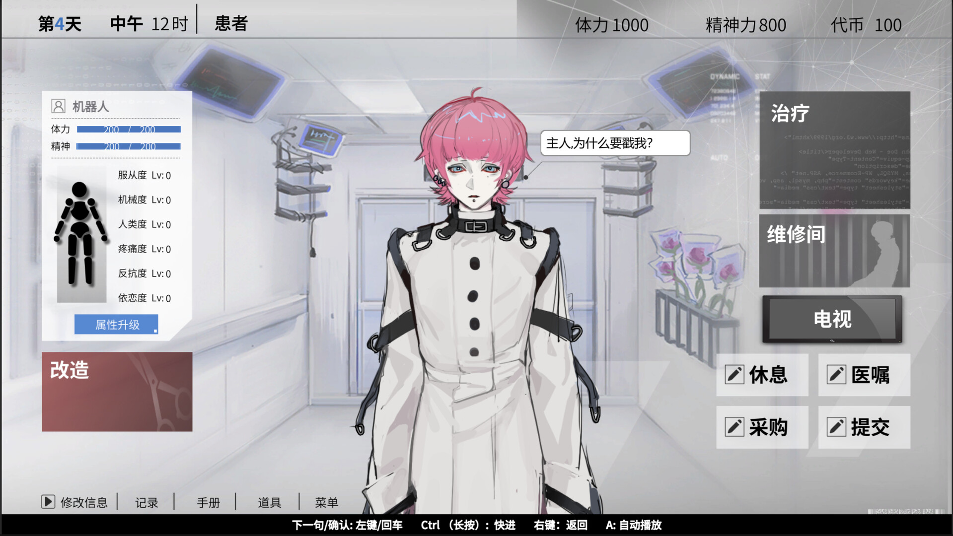 You'll participate in various "treatment sessions" with this android, ranging from tender care to intense punitive experiences, as you navigate the thin, dangerous line between love, submission, pain, and control.