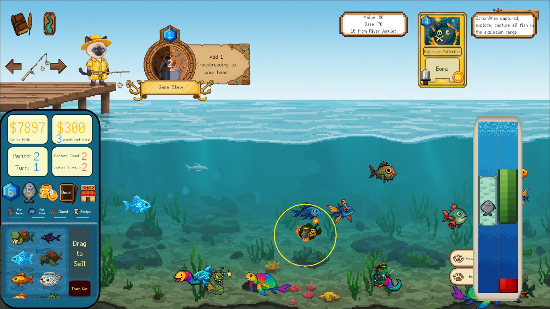FishingCard is a Card Roguelike game where fish are not just fish—they are also cards. In the game, you'll play as a little kitten who can't afford cat food, embarking on a survival adventure of strategy and luck that spans a 6-period, 24-turn challenge. The player's goal is to build a pond ecosystem that can sustainably generate money to pay for the ever-increasing cost of cat food. The core gameplay loop revolves around the cycle of "buying fish fry from a shop - building a pond - fishing - selling for money." Additionally, at the end of each round, you will also earn interest from your pond.