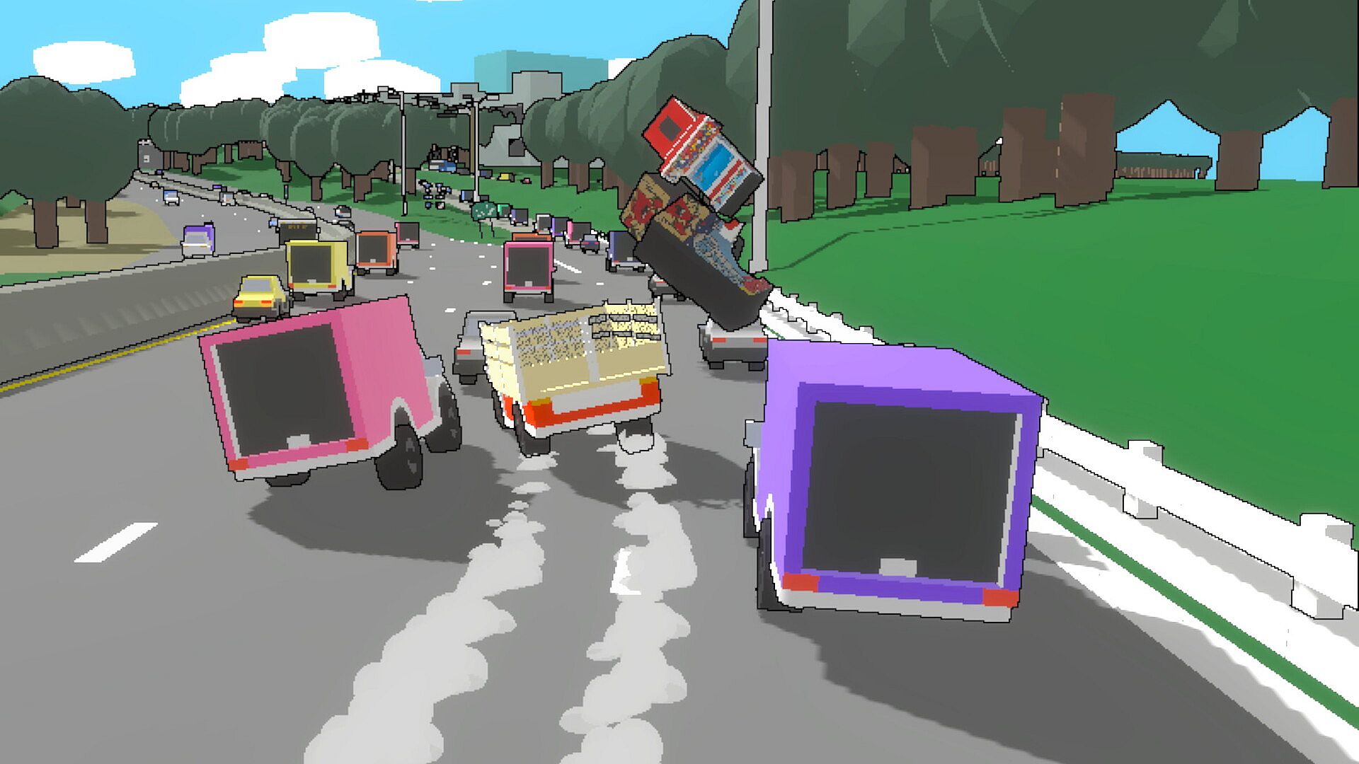 Drive along I-277 carrying your favorite cargo including local brewery cans, empty 12-piece chicken boxes, giant red letters , Crab Volleyball arcade cabinets and more! Each cargo has its own impact on the way the game is played and have unique scoring mechanics.