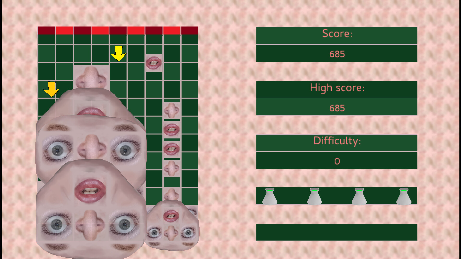 Falling Face Fragments is a falling block puzzle game. As eyes, noses, and mouths fall from the sky, you must carefully choose where they land in order to assemble faces correctly and clear them. There are three modes of play included: