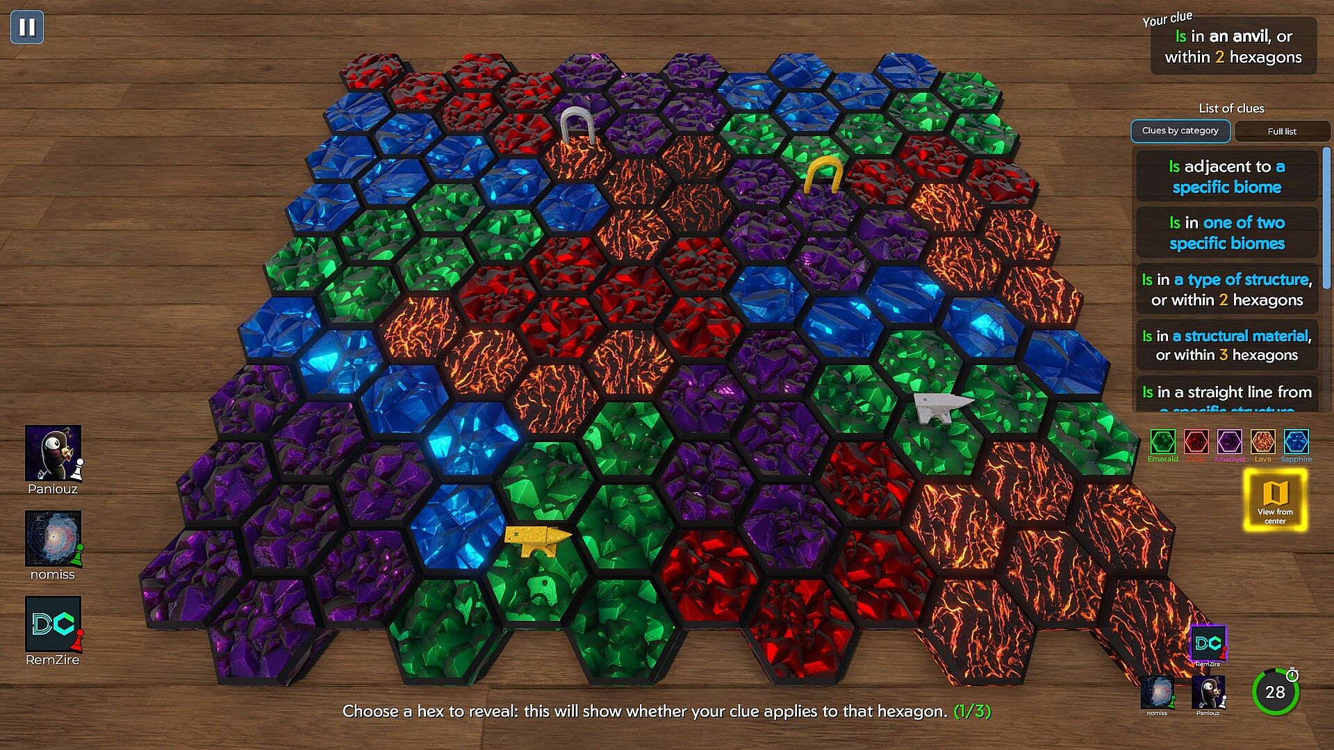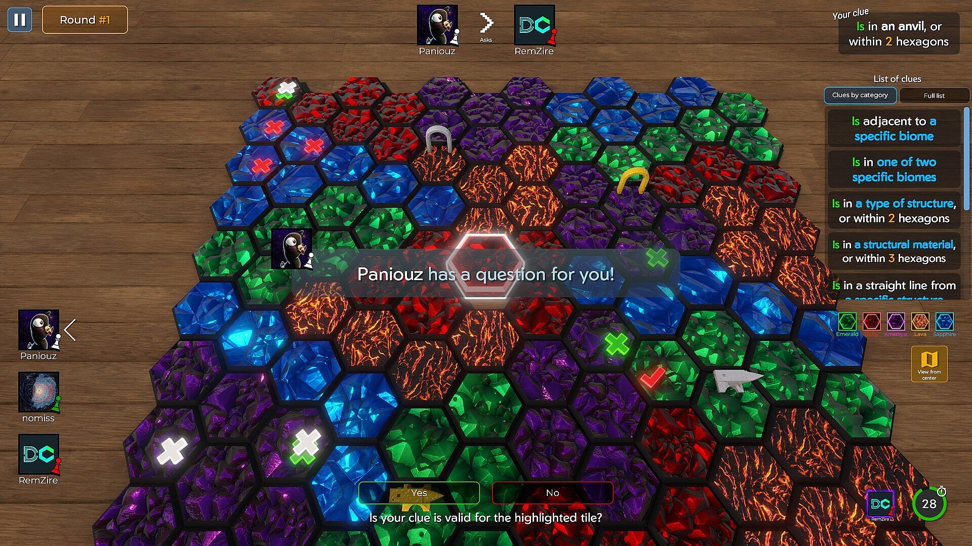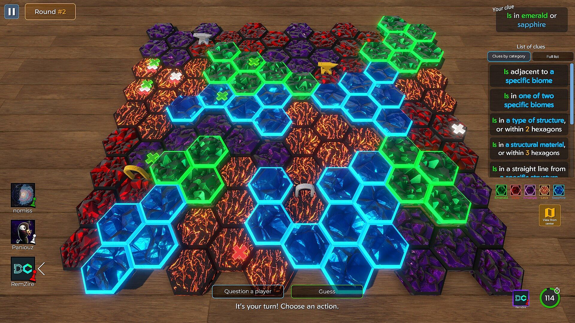 To deduce the other players' clues, you must take turns asking a question to the person of your choice. The player answering must state in front of everyone the possibility of being on the requested tile according to their clue.
