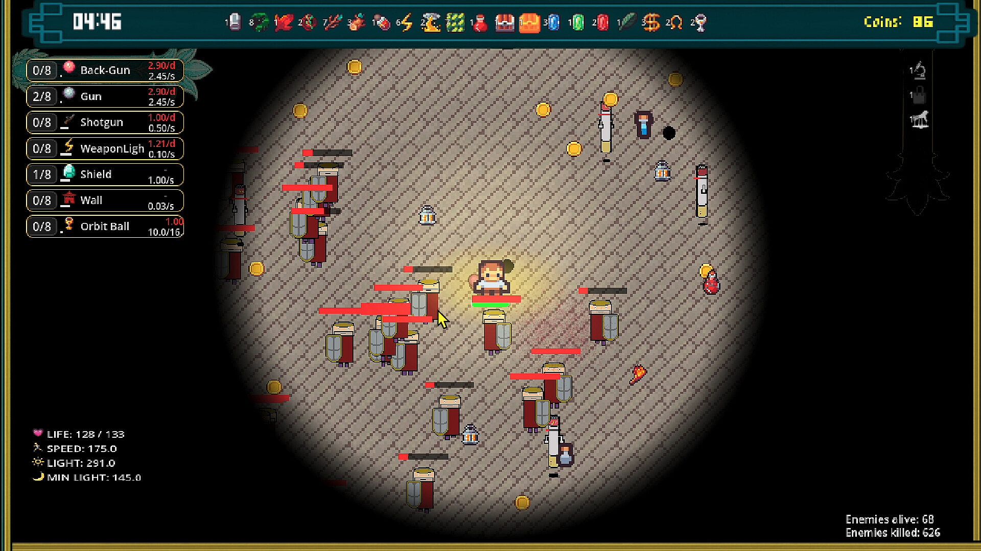 Weapons & Magic (manual and automatic, upgradeable up to seven levels.). (12)