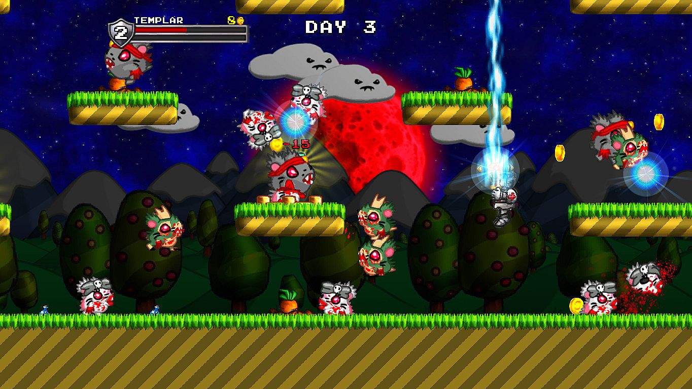During the day, hamsters come to steal the King's carrots. The knight must prevent the carrots from being carried off or be defeated. When the dark of night falls and the blood moons rises a foul curse transforms the hamsters into bloodthirsty demons. To battle the growing menace, the knight can upgrade his weapons and armor or pay to open treasure chests filled with vitality and elixirs.