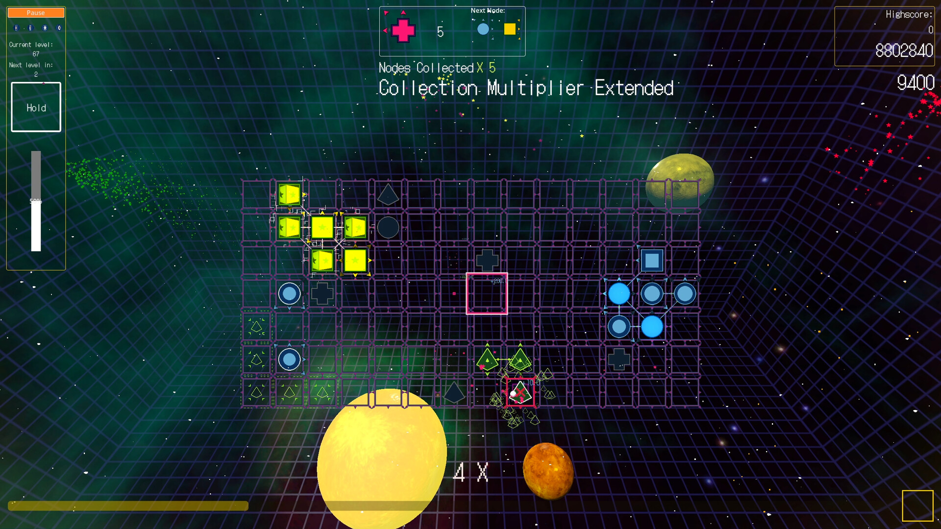 Align and connect the Nodes to grow their Cores until they are big enough to collect and score.