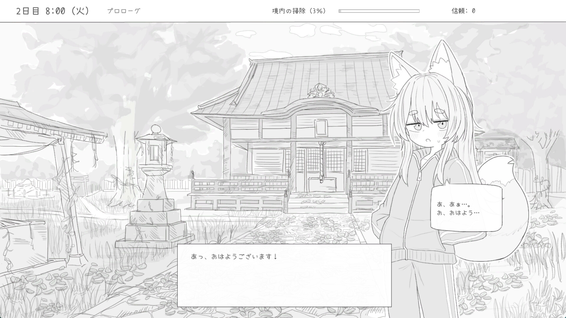 You're tasked with cleaning the local shrine in your hometown after the previous caretaker passed away. At first, it seems like a chore, but then you're greeted by the shrine's resident, a fox girl named Mao. She's hesitant to approach you, having been out of touch with humans for a very long time. However, she seems to appreciate your efforts in cleaning the shrine she calls home.