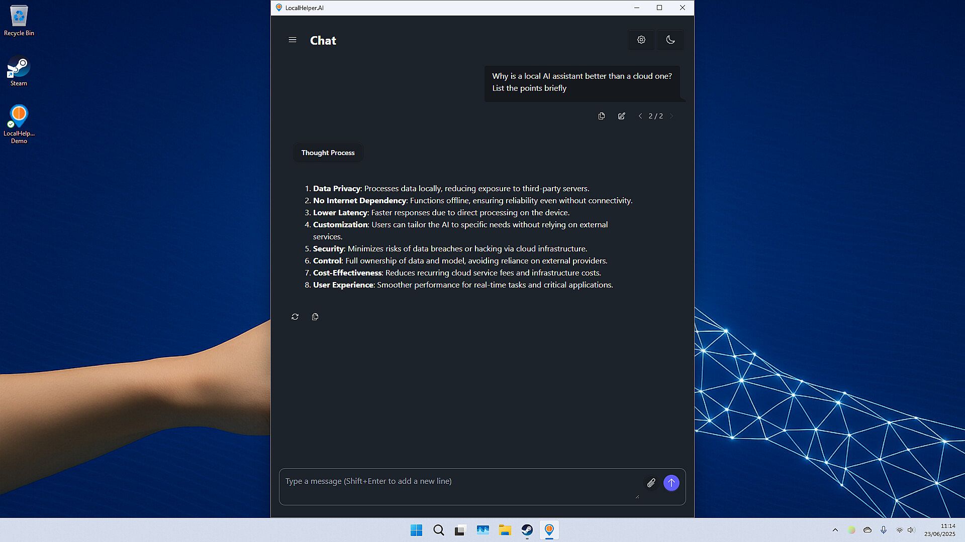 LocalHelper to idealne rozwiązanie dla osób dbających o prywatność, pracujących zdalnie lub każdego, kto chce korzystać z asystenta AI bez oddawania kontroli nad swoimi danymi.