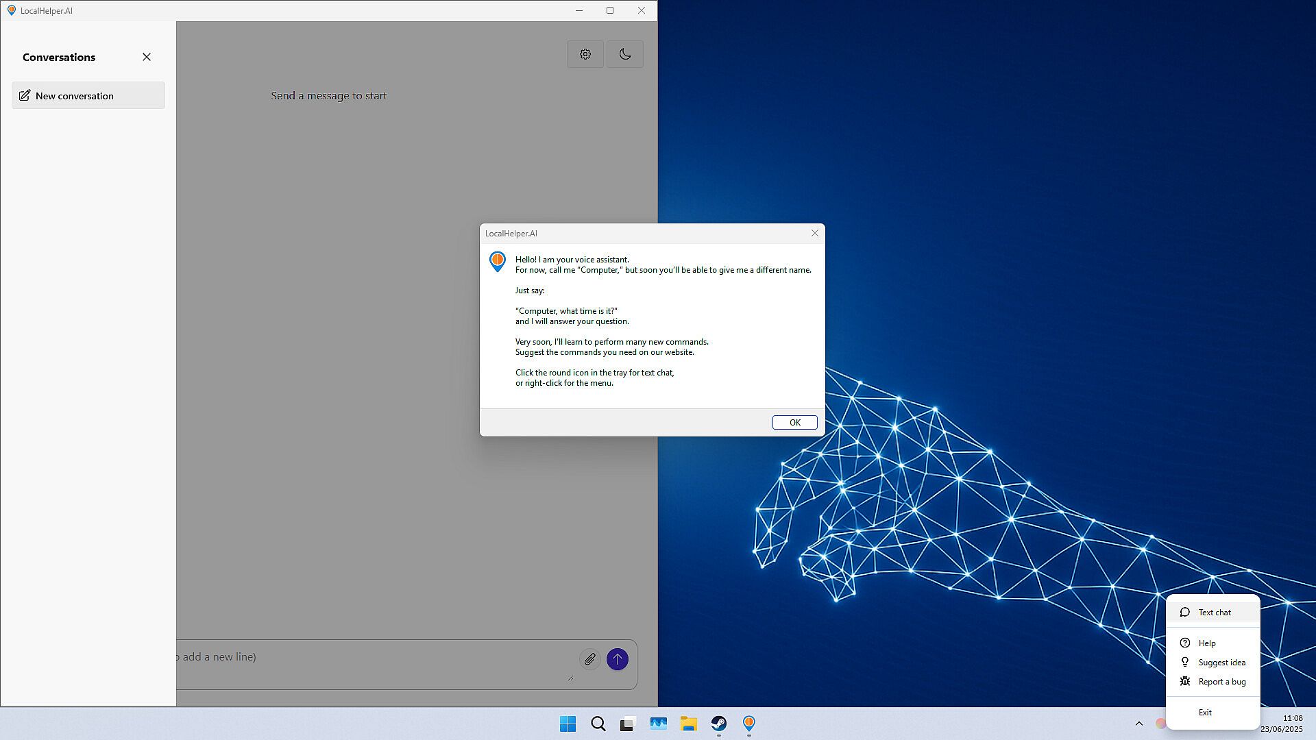 LocalHelper.ai to prywatny asystent AI z obsługą głosu do domu i biura — działa w całości na Twoim komputerze, bez wysyłania danych do chmury.