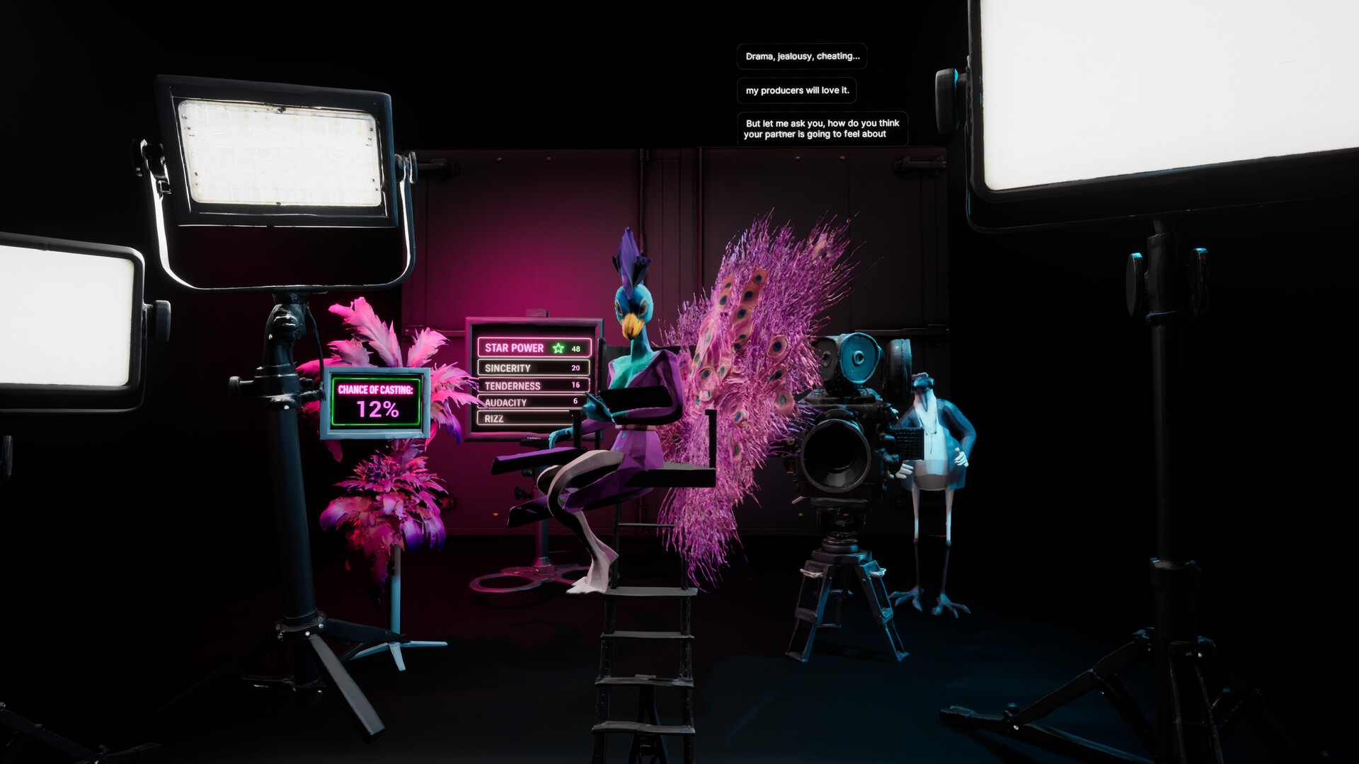 Underneath the feathers and flirtation lies a ruthless game of viewership, ratings, and network television. It's up to you to keep viewers hooked by stirring up just enough chaos to thrill the producers—without driving your love interests to the brink. Play it too sweet, and you’ll be forgettable. Push too hard, and the whole cast might walk out. Every moment is a high-wire act between heartbreak and headline.