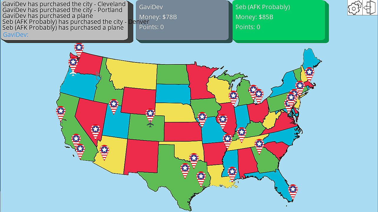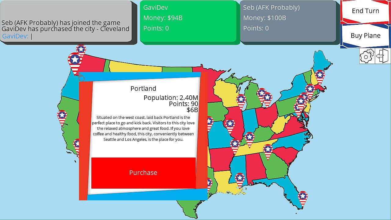 PlayUSA is an online turn-based strategy game in which the goal is to buy as many cities as you can with your starting balance of $100 billion. To win the game you need to