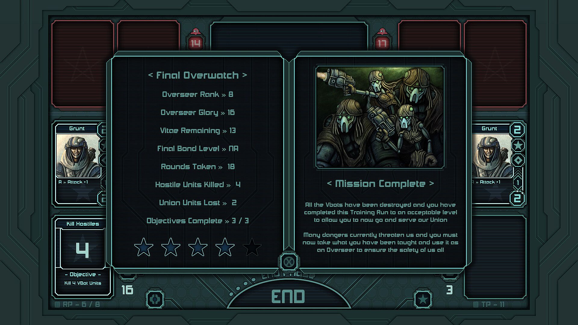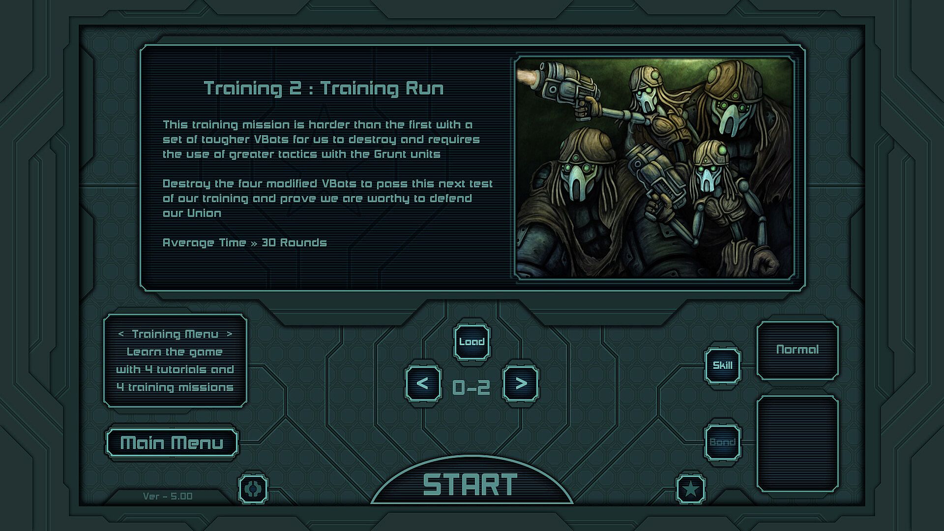 An example Training mission in the base game is First Run, which is aimed to give you a taste of Siberian Dawn and the basics of a Mission. The Objectives in this Mission will take you through the steps towards the final Objective to kill the 4 VBots, the Missions in Mission Pack 1 and those to follow will contain multiple Objectives offering a longer more challenging game. First Run also contains 2 Units, the Grunt and the Scribe. The Grunt is your basic Union military Unit that will be used to attack the VBots, and the Scribe is a Guild support Unit who will help you gain Glory. Full Missions add 18 new Units to these 2 basic ones.