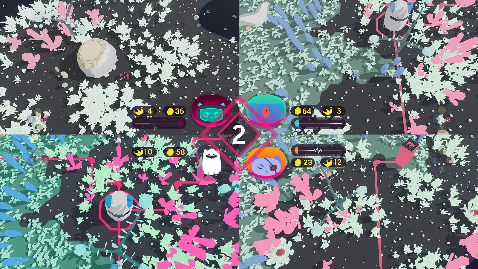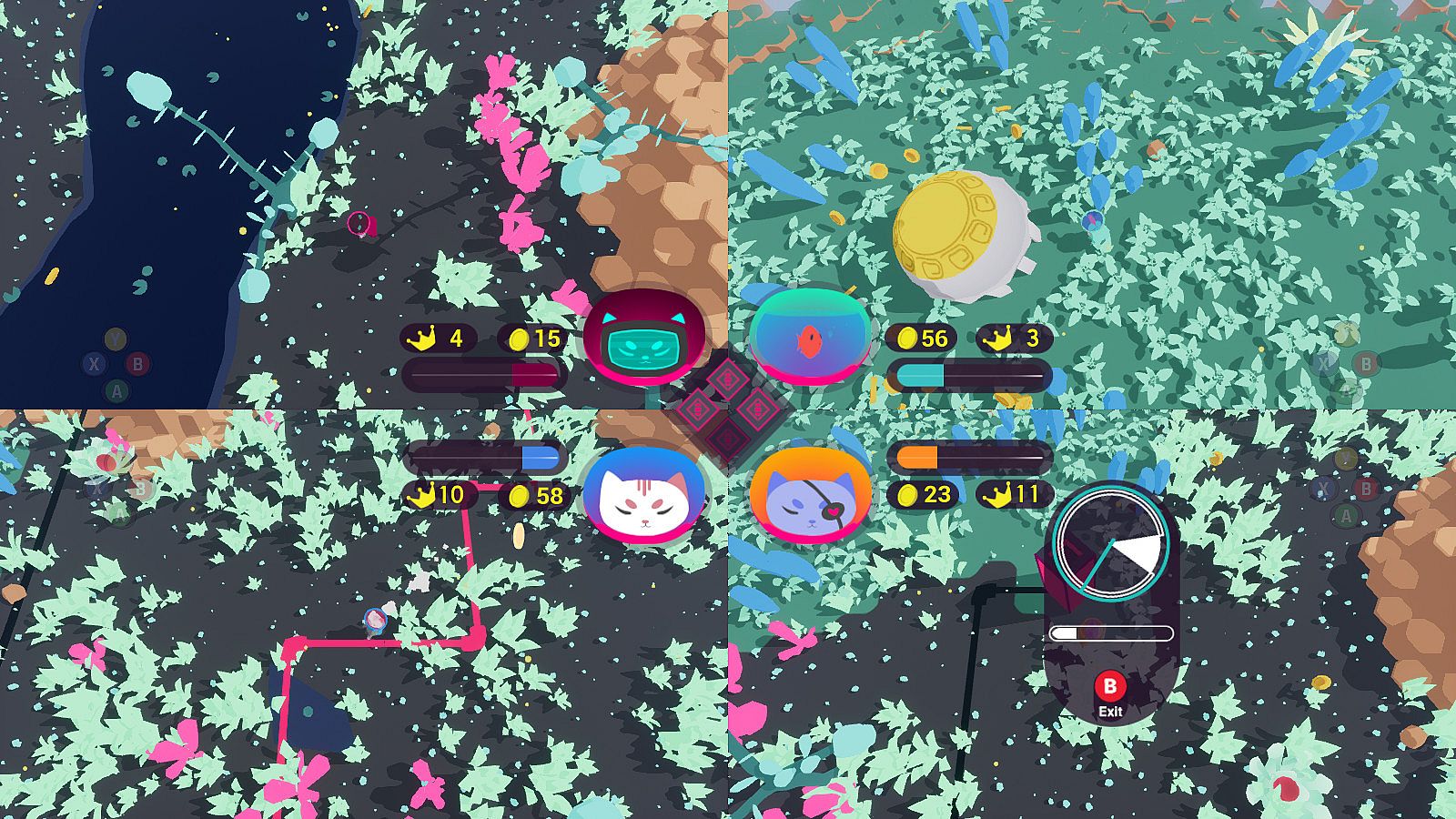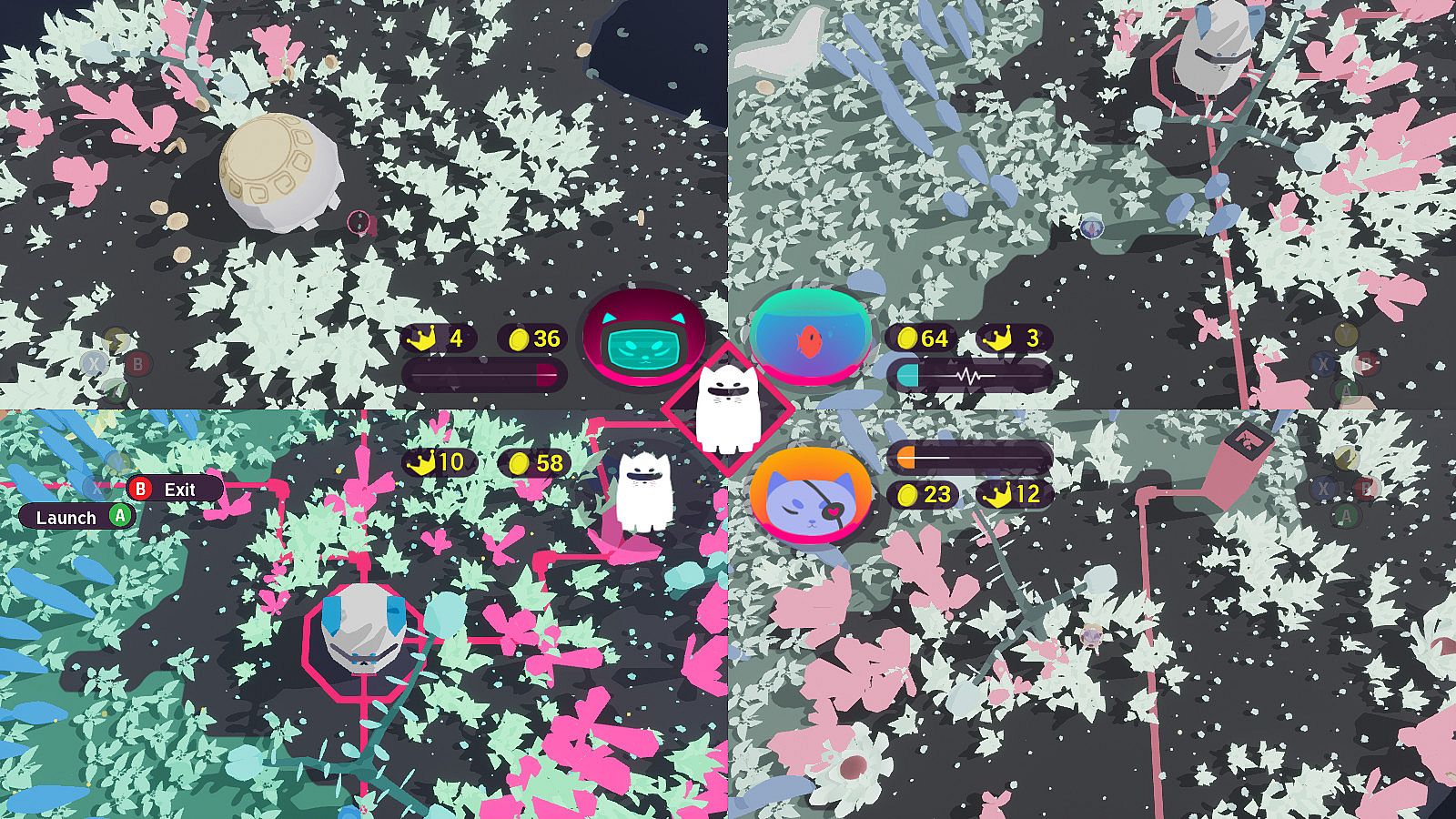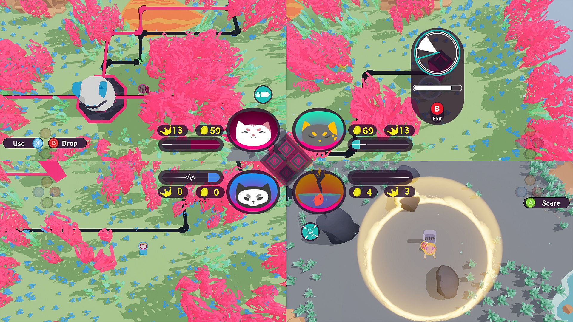 Four cats break out of prison on a distant alien planet and race to steal a ship before their suits lose power. Players compete and cooperate in 2-4 player local multiplayer to activate four generators, claim captaincy, and escape procedurally generated maps filled with vibrant biomes. Collect gold for disruptive tools like vine traps and hammers, while navigating as corporeal cats or spectral forms after death to sap energy from rivals.