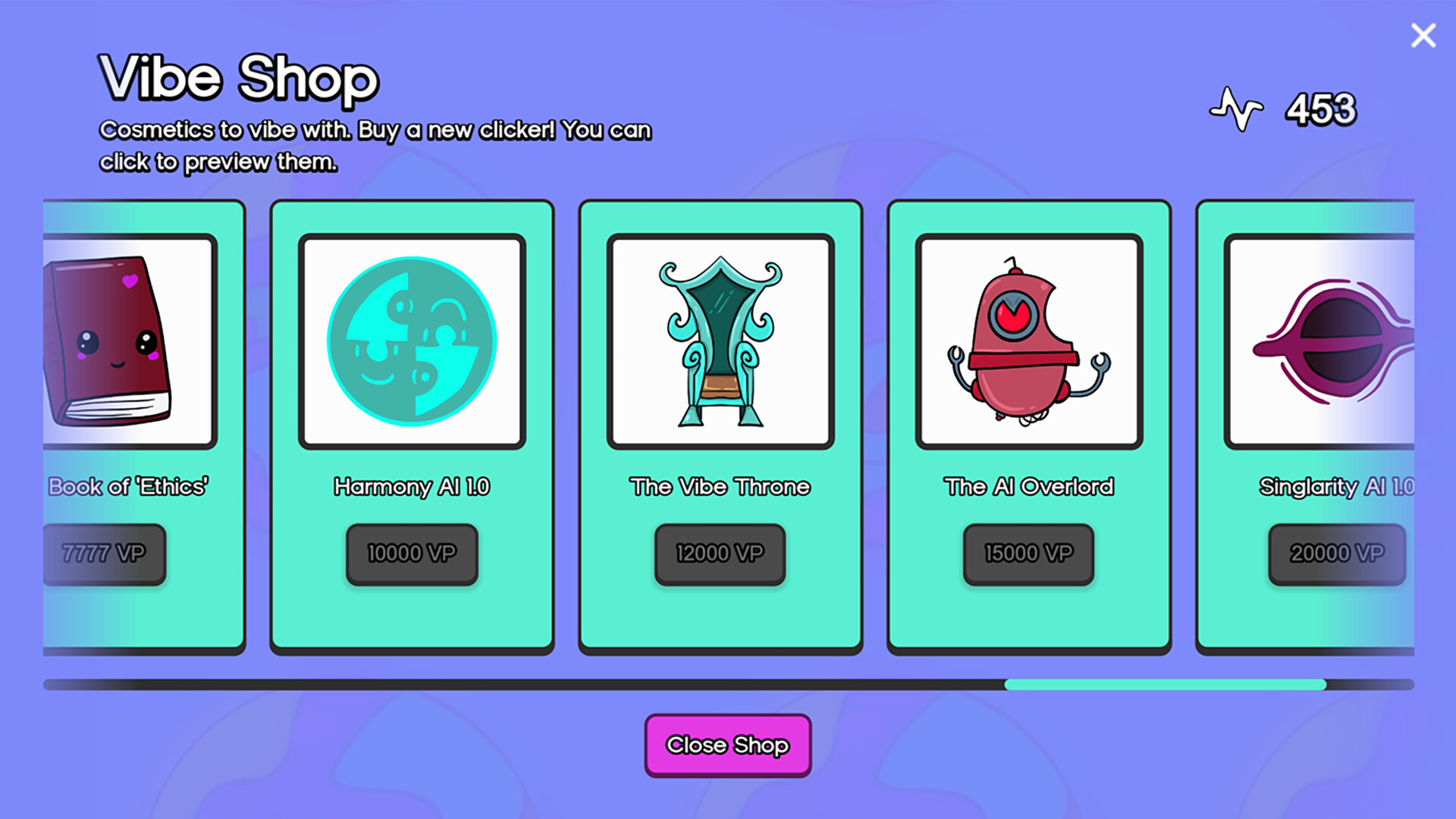 Unique, hand-drawn art - All in-game art is hand-drawn and includes over 50 unique game icons and clicker art made by TheAverageGoob! The Vibe Shop is full of items to change your clicker once you become a Vibe Lord.