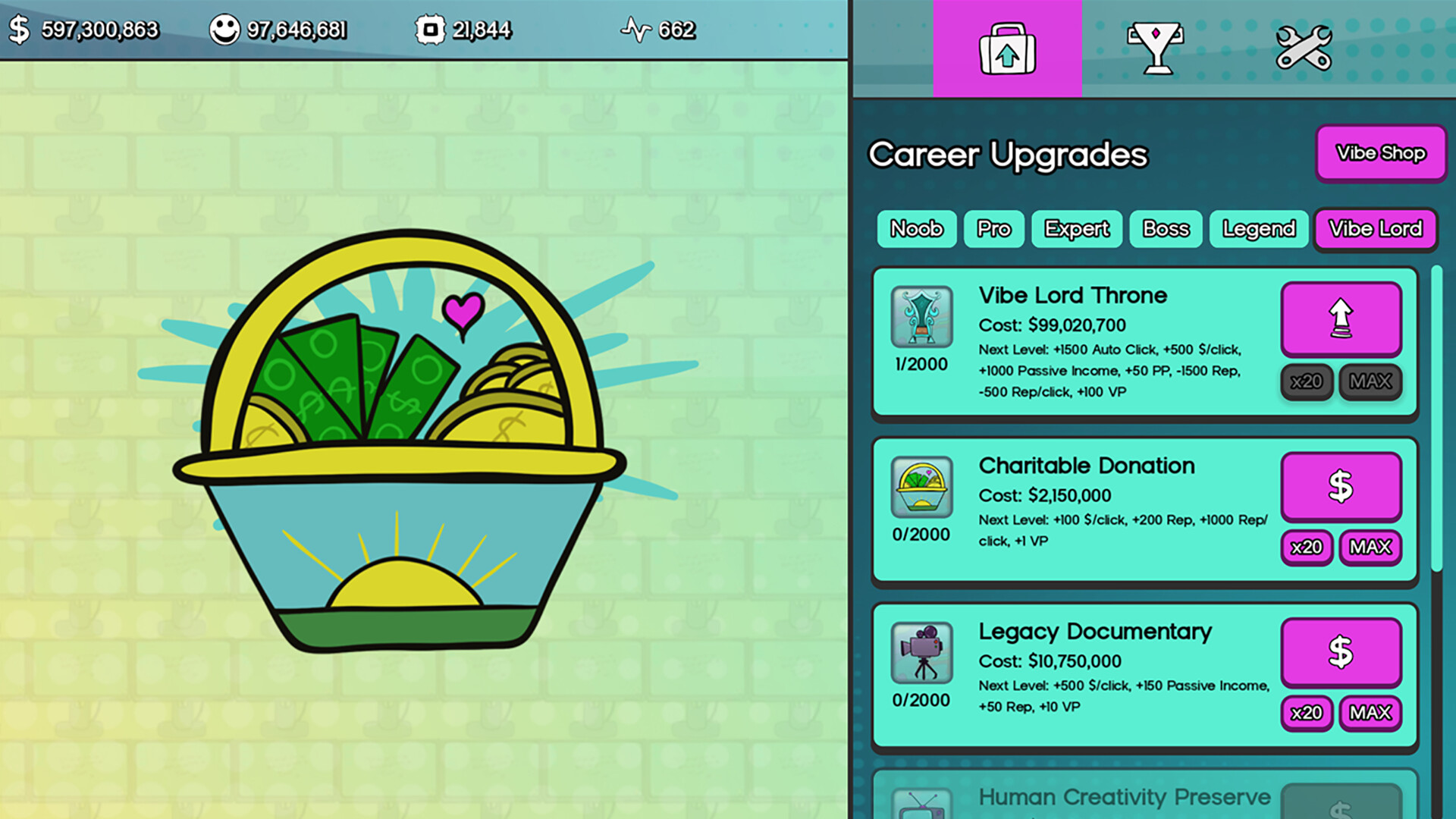 Six Career Phases - Progress through 6 fun and satirical career phases, from college graduate to legend, while ultimately trying to achieve Vibe Lord status. The only way to fully embrace change is to embrace risks.