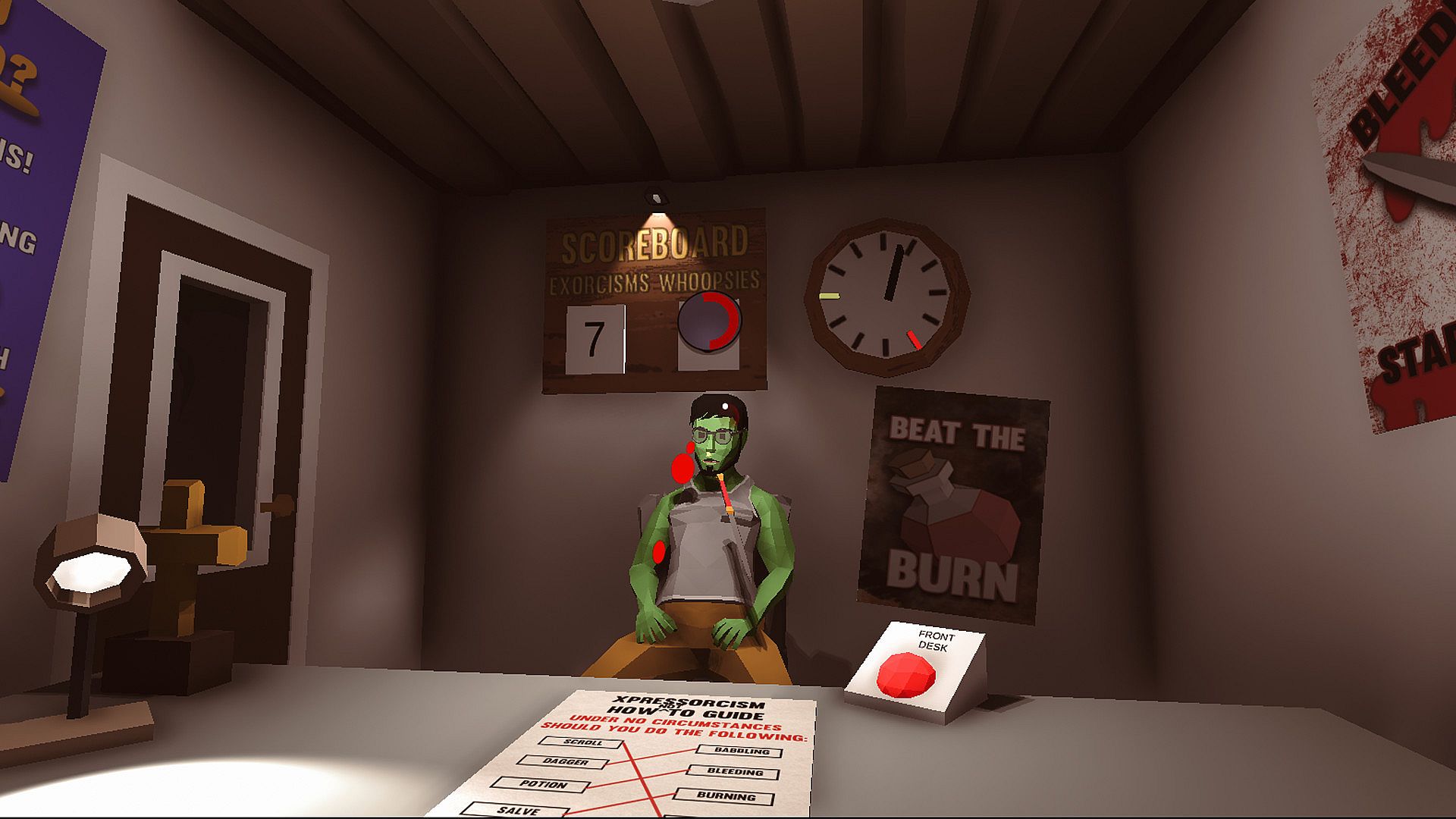 What do rock music, D&D, and vulgar tv shows all have in common? Turns out they really ARE tools of Devil and people are being possessed by the boat load. As an Xpressorcist (Xpress Exorcist) it is your job to exorcise the demons from clients as quickly as possible. Why the urgency? Because you get paid by the exorcism and they'll blow up after 10 seconds!