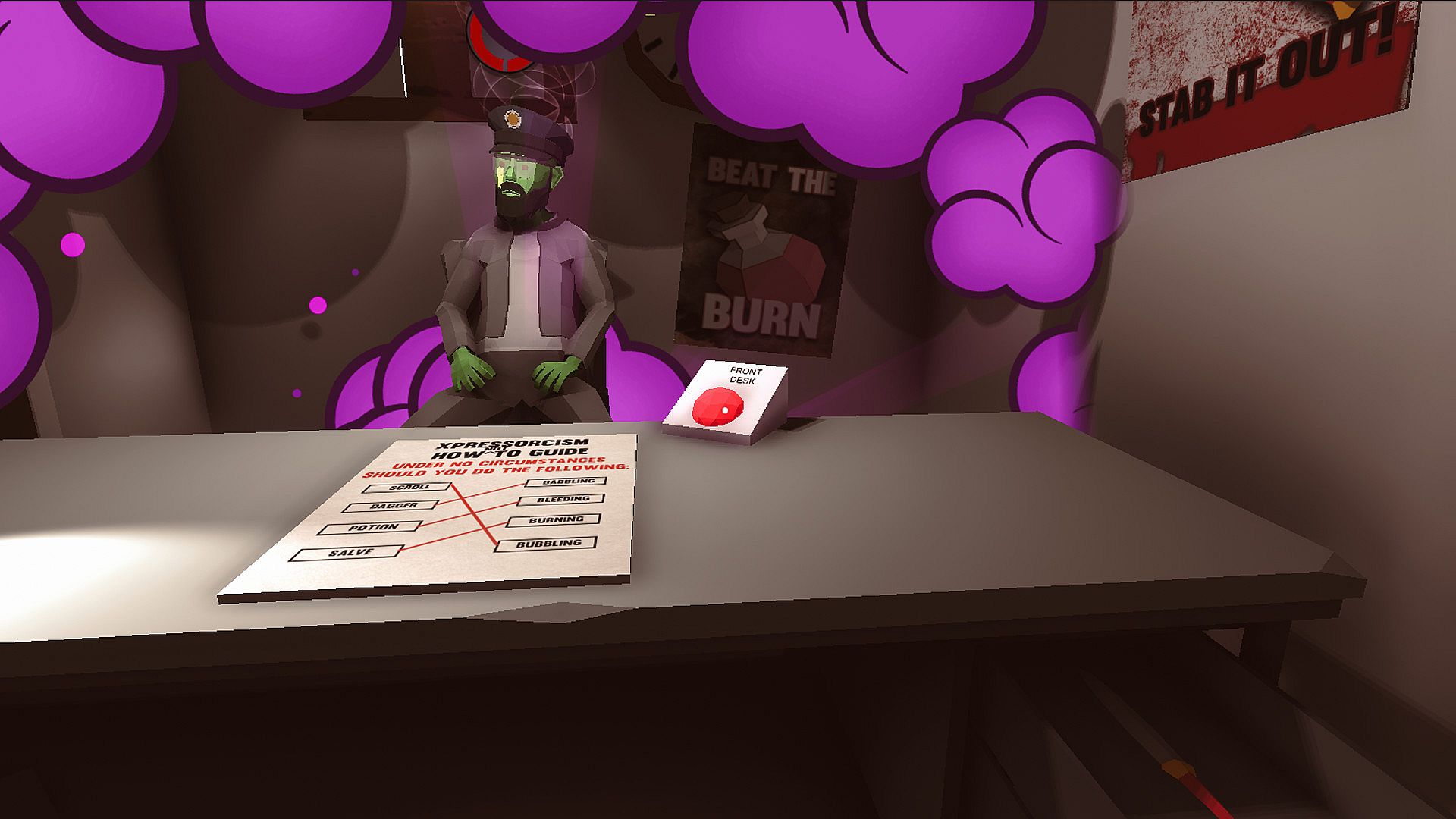 The patented Xpressorcist System makes exorcising the damned as easy as pie. Just throw the correct Cure Item at the possessed based on their symptoms and bingo bango, they're cured! A small word of caution, if you use a wrong Cure Item or don't apply the correct Cure Item in time, your client may explode! Unfortunately, exploded people do not pay for services rendered.